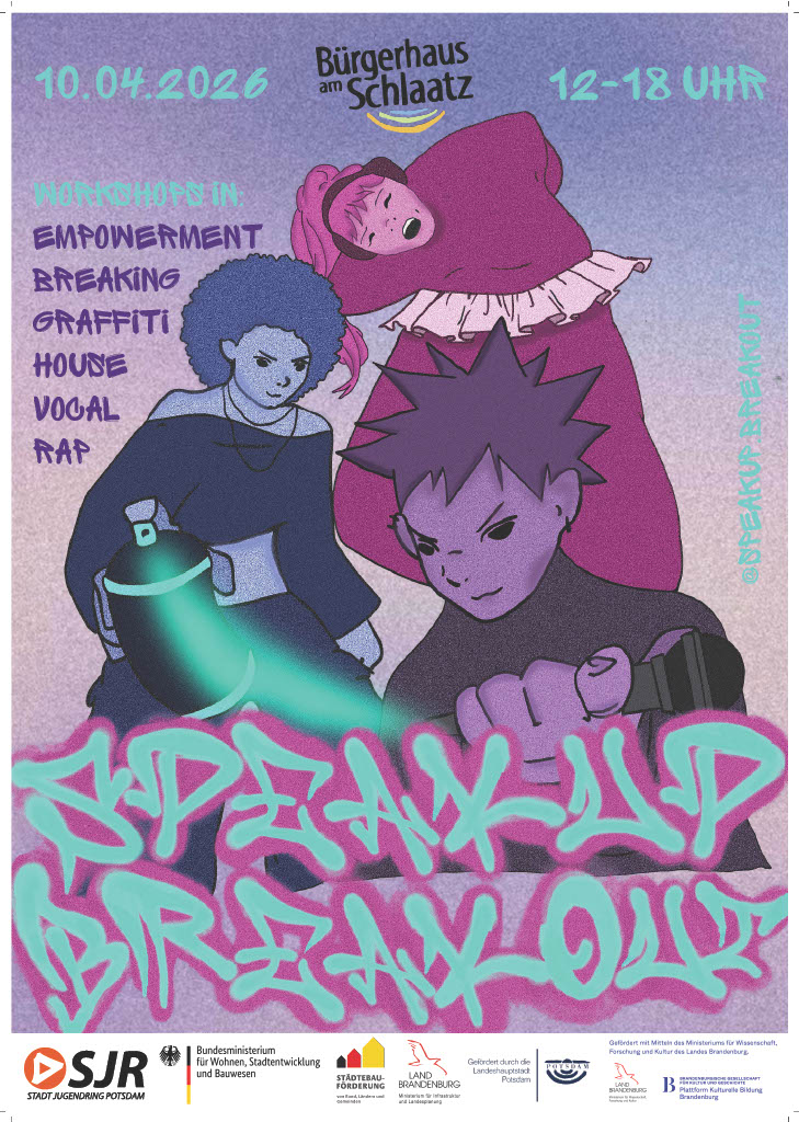 Speak Up – Break Out! ist ein studentisches Projekt, welches Hip-Hop und Feminismus miteinander verbindet. Die männlichen dominierte Hip-Hop Szene soll dabei kritisch hinterfragt und durch Flinta*-focused Angebote aufgebrochen werden. Über den Tag verteilt sollen vier Workshops stattfinden, wobei das Projekt den Fokus auf Rap, Vocal Coaching, Breakdance und House Dance legt. Diese Workshops werden ausschließlich von Flinta* Personen geleitet und soll jugendlichen Flinta* bzw. Minta* die Chance geben, Hip-Hop für sich zu entdecken und ihre eigene Selbstwirksamkeit zu spüren. Die Themen Feminismus und Empowerment werden dabei aktiv vermittelt. Parallel gibt es zu den vier festen Workshops auch eine angeleitete Graffiti-Wand, bei welchem sich Jugendlichen frei kreativ entfalten können.